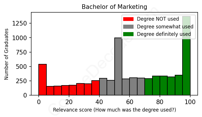 The verdict? Below average. Overall, with an average relevance score of 59%, Marketing graduates have a lower likelihood (-8%) of finding work in this field compared to the average graduate across all fields: