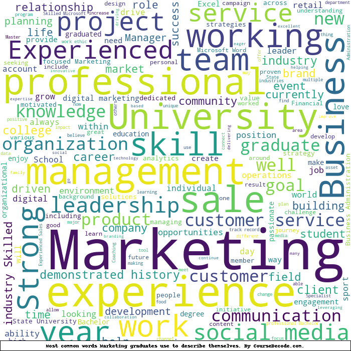 Here is a visual representation of the most common words seen in the "about" section of LinkedIn profiles who have a Bachelor degree in Marketing. This may or may not be useful: