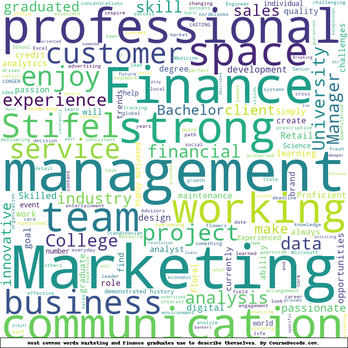 Here is a visual representation of the most common words seen in the "about" section of LinkedIn profiles who have a Bachelor degree in Marketing and Finance. This may or may not be useful: