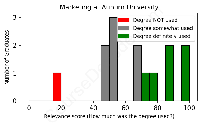 The verdict? Slightly below average. Overall, with an average relevance score of 65%, Marketing graduates from Auburn University have a slightly lower likelihood (-2%) of finding work in this field compared to the average graduate across all fields: