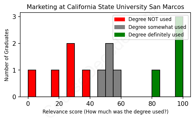 The verdict? Significantly below average. Overall, with an average relevance score of 53%, Marketing graduates from California State University San Marcos have a much lower likelihood (-14%) of finding work in this field compared to the average graduate across all fields: