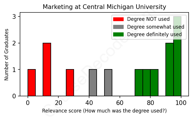 The verdict? Below average. Overall, with an average relevance score of 60%, Marketing graduates from Central Michigan University have a lower likelihood (-7%) of finding work in this field compared to the average graduate across all fields: