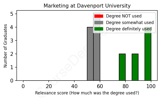The verdict? Slightly above average. Overall, with an average relevance score of 70%, Marketing graduates from Davenport University have a slightly higher likelihood (+3%) of finding work in this field compared to the average graduate across all fields:
