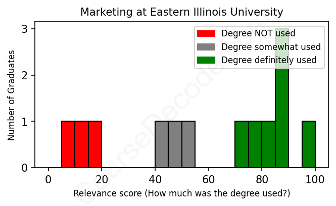 The verdict? Below average. Overall, with an average relevance score of 58%, Marketing graduates from Eastern Illinois University have a lower likelihood (-9%) of finding work in this field compared to the average graduate across all fields:
