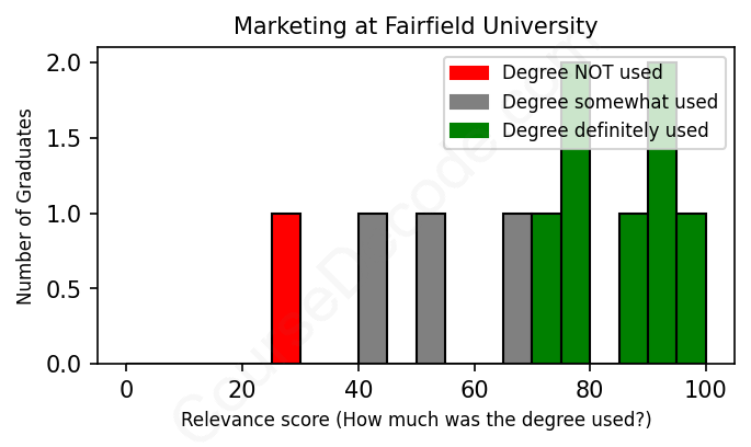 The verdict? Slightly above average. Overall, with an average relevance score of 71%, Marketing graduates from Fairfield University have a slightly higher likelihood (+4%) of finding work in this field compared to the average graduate across all fields: