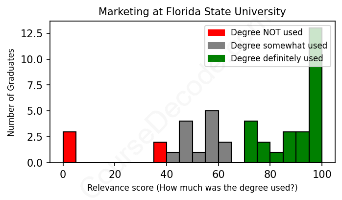 The verdict? Slightly above average. Overall, with an average relevance score of 70%, Marketing graduates from Florida State University have a slightly higher likelihood (+3%) of finding work in this field compared to the average graduate across all fields: