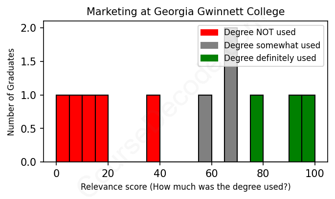 The verdict? Significantly below average. Overall, with an average relevance score of 48%, Marketing graduates from Georgia Gwinnett College have a much lower likelihood (-19%) of finding work in this field compared to the average graduate across all fields: