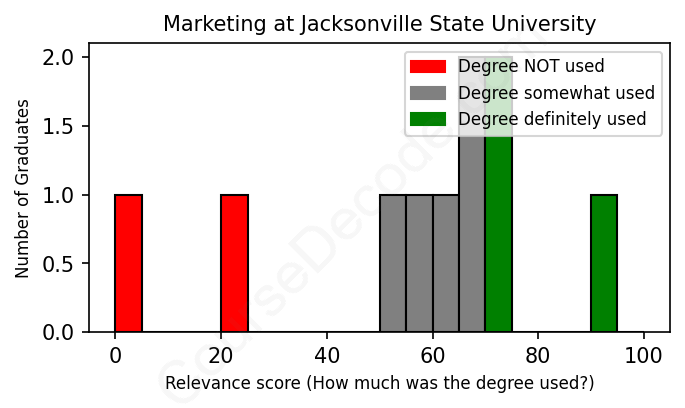 The verdict? Significantly below average. Overall, with an average relevance score of 56%, Marketing graduates from Jacksonville State University have a much lower likelihood (-11%) of finding work in this field compared to the average graduate across all fields: