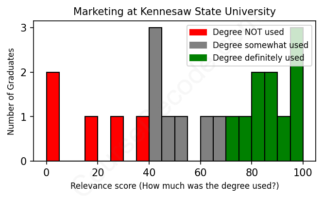 The verdict? Below average. Overall, with an average relevance score of 59%, Marketing graduates from Kennesaw State University have a lower likelihood (-8%) of finding work in this field compared to the average graduate across all fields: