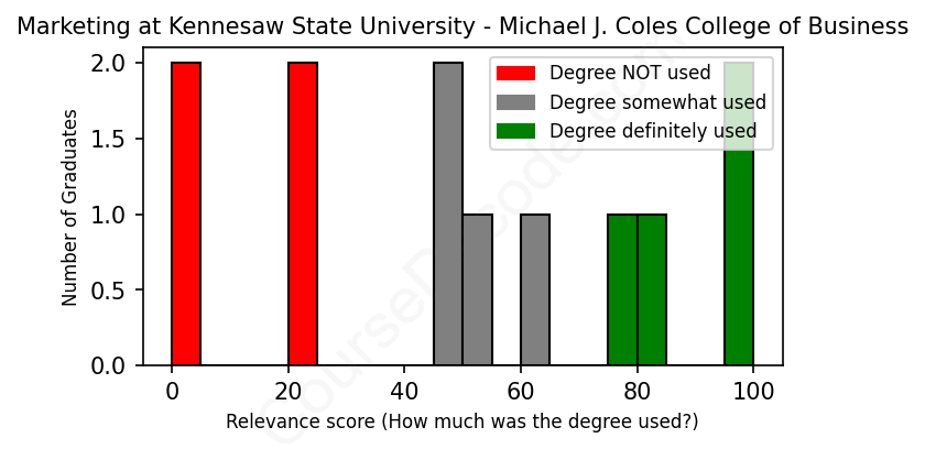 The verdict? Significantly below average. Overall, with an average relevance score of 50%, Marketing graduates from Kennesaw State University - Michael J. Coles College of Business have a much lower likelihood (-17%) of finding work in this field compared to the average graduate across all fields: