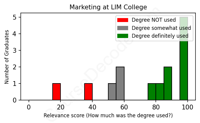 The verdict? Above average. Overall, with an average relevance score of 74%, Marketing graduates from LIM College have a higher likelihood (+7%) of finding work in this field compared to the average graduate across all fields:
