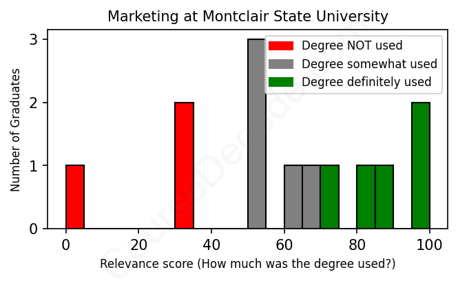 The verdict? Below average. Overall, with an average relevance score of 60%, Marketing graduates from Montclair State University have a lower likelihood (-7%) of finding work in this field compared to the average graduate across all fields: