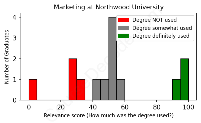 The verdict? Significantly below average. Overall, with an average relevance score of 51%, Marketing graduates from Northwood University have a much lower likelihood (-16%) of finding work in this field compared to the average graduate across all fields: