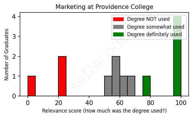 The verdict? Slightly below average. Overall, with an average relevance score of 62%, Marketing graduates from Providence College have a slightly lower likelihood (-5%) of finding work in this field compared to the average graduate across all fields: