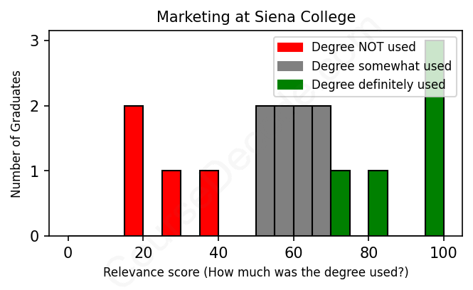 The verdict? Below average. Overall, with an average relevance score of 60%, Marketing graduates from Siena College have a lower likelihood (-7%) of finding work in this field compared to the average graduate across all fields: