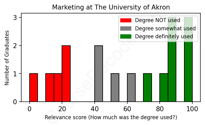 The verdict? Below average. Overall, with an average relevance score of 57%, Marketing graduates from The University of Akron have a lower likelihood (-10%) of finding work in this field compared to the average graduate across all fields: