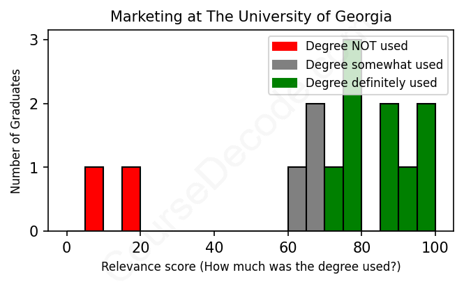 The verdict? Slightly above average. Overall, with an average relevance score of 69%, Marketing graduates from The University of Georgia have a slightly higher likelihood (+2%) of finding work in this field compared to the average graduate across all fields: