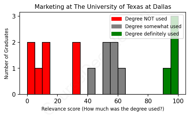 The verdict? Significantly below average. Overall, with an average relevance score of 47%, Marketing graduates from The University of Texas at Dallas have a much lower likelihood (-20%) of finding work in this field compared to the average graduate across all fields: