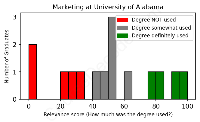 First, some facts. Of the Marketing graduates from University of Alabama we've analyzed , here's how many have used (or NOT used) their degree in their career: