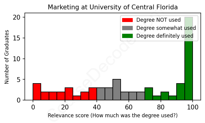 The verdict? Below average. Overall, with an average relevance score of 61%, Marketing graduates from University of Central Florida have a lower likelihood (-6%) of finding work in this field compared to the average graduate across all fields: