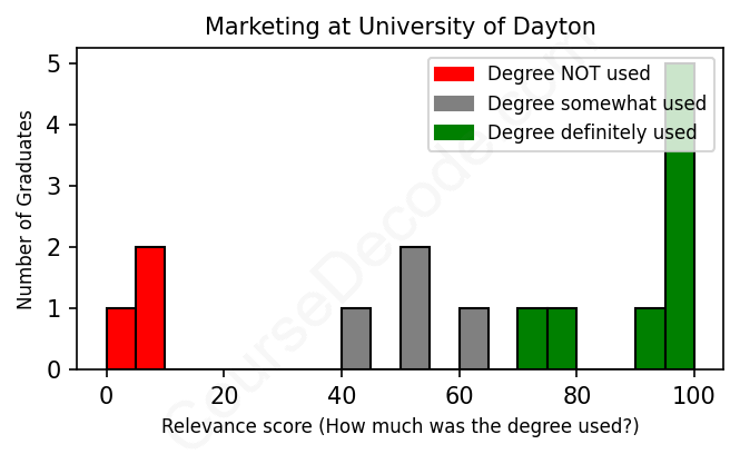 The verdict? Slightly below average. Overall, with an average relevance score of 63%, Marketing graduates from University of Dayton have a slightly lower likelihood (-4%) of finding work in this field compared to the average graduate across all fields: