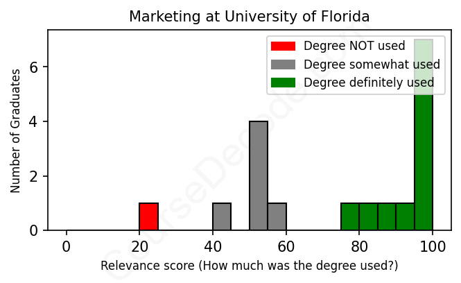 The verdict? Above average. Overall, with an average relevance score of 75%, Marketing graduates from University of Florida have a higher likelihood (+8%) of finding work in this field compared to the average graduate across all fields: