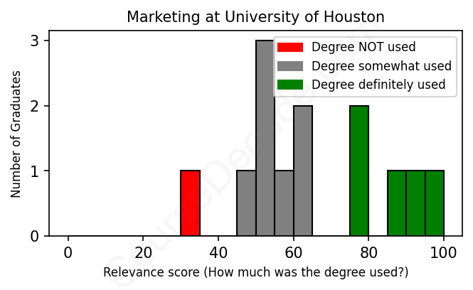 The verdict? Slightly below average. Overall, with an average relevance score of 64%, Marketing graduates from University of Houston have a slightly lower likelihood (-3%) of finding work in this field compared to the average graduate across all fields: