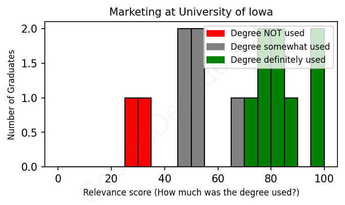 The verdict? Slightly below average. Overall, with an average relevance score of 66%, Marketing graduates from University of Iowa have a slightly lower likelihood (-1%) of finding work in this field compared to the average graduate across all fields: