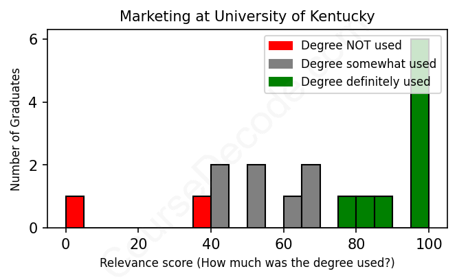 The verdict? Slightly above average. Overall, with an average relevance score of 70%, Marketing graduates from University of Kentucky have a slightly higher likelihood (+3%) of finding work in this field compared to the average graduate across all fields: