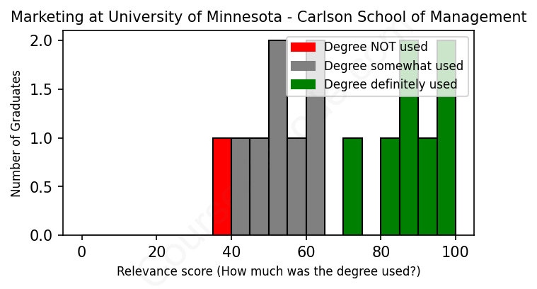 The verdict? Slightly above average. Overall, with an average relevance score of 68%, Marketing graduates from University of Minnesota - Carlson School of Management have a slightly higher likelihood (+1%) of finding work in this field compared to the average graduate across all fields: