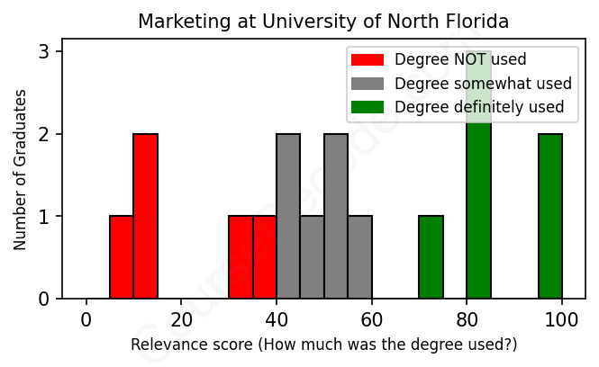 The verdict? Significantly below average. Overall, with an average relevance score of 53%, Marketing graduates from University of North Florida have a much lower likelihood (-14%) of finding work in this field compared to the average graduate across all fields: