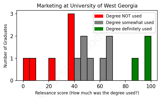 The verdict? Significantly below average. Overall, with an average relevance score of 50%, Marketing graduates from University of West Georgia have a much lower likelihood (-17%) of finding work in this field compared to the average graduate across all fields: