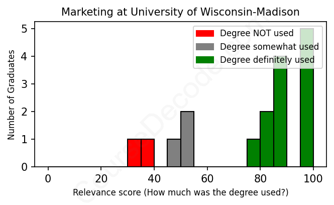 The verdict? Above average. Overall, with an average relevance score of 76%, Marketing graduates from University of Wisconsin-Madison have a higher likelihood (+9%) of finding work in this field compared to the average graduate across all fields: