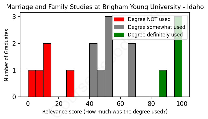 The verdict? Significantly below average. Overall, with an average relevance score of 50%, Marriage and Family Studies graduates from Brigham Young University - Idaho have a much lower likelihood (-17%) of finding work in this field compared to the average graduate across all fields:
