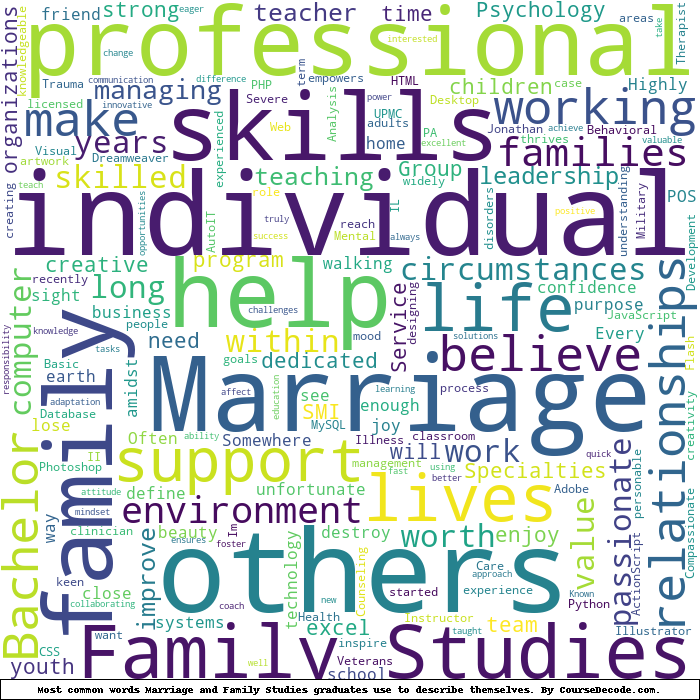 Here are all colleges offering a Bachelor degree in Marriage and Family Studies (ordered by the average relevance score of their Marriage and Family Studies graduates, best to worst) where we have analyzed at least 10 of their graduates: