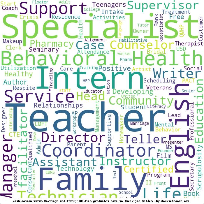 Here is a visual representation of the most common words in job titles for Marriage and Family Studies graduates (this is across all Marriage and Family Studies graduates we've analyzed, not just those who went to Brigham Young University - Idaho):