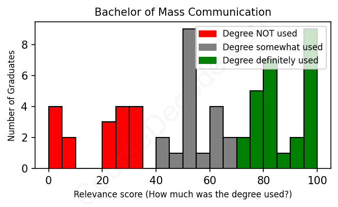The verdict? Below average. Overall, with an average relevance score of 58%, Mass Communication graduates have a lower likelihood (-9%) of finding work in this field compared to the average graduate across all fields: