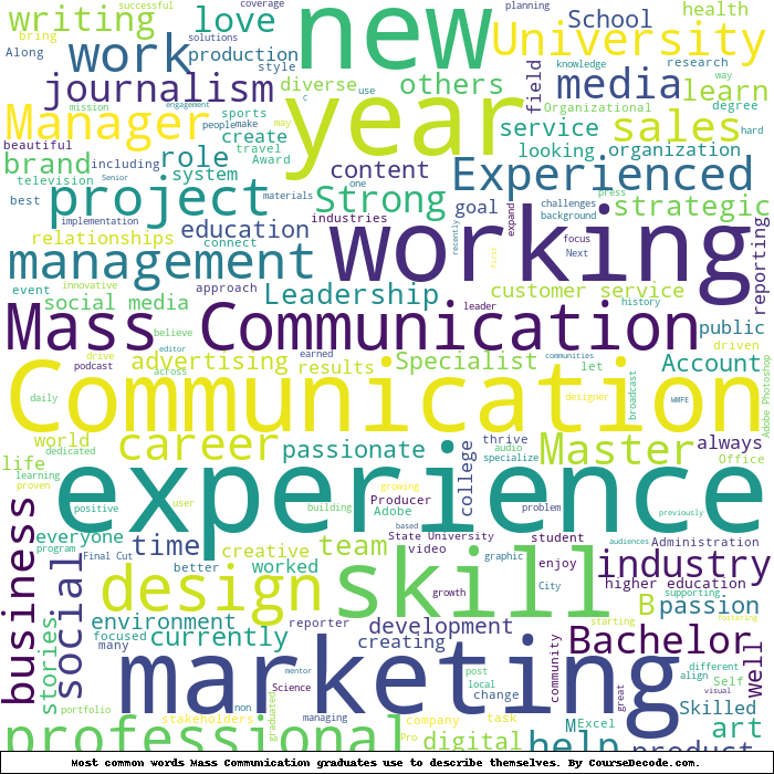 Here is a visual representation of the most common words seen in the "about" section of LinkedIn profiles who have a Bachelor degree in Mass Communication. This may or may not be useful: