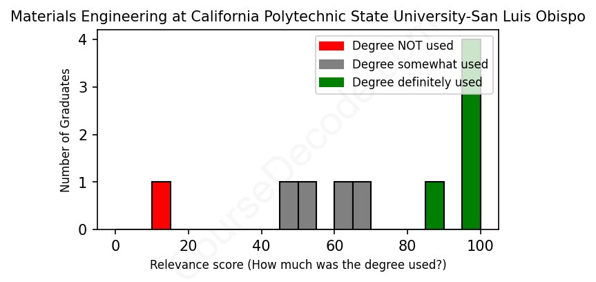 The verdict? Slightly above average. Overall, with an average relevance score of 71%, Materials Engineering graduates from California Polytechnic State University-San Luis Obispo have a slightly higher likelihood (+4%) of finding work in this field compared to the average graduate across all fields: