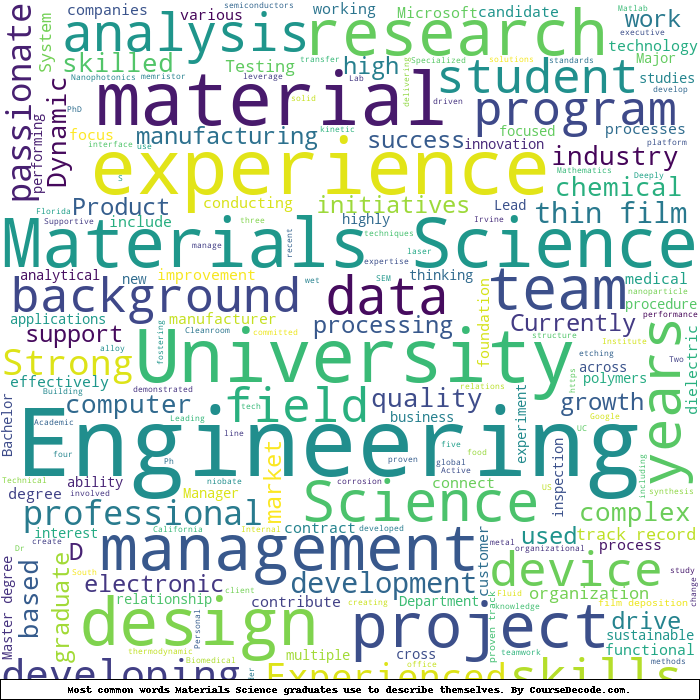 Here is a visual representation of the most common words seen in the "about" section of LinkedIn profiles who have a Bachelor degree in Materials Science. This may or may not be useful:
