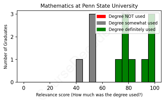 The verdict? Above average. Overall, with an average relevance score of 74%, Mathematics graduates from Penn State University have a higher likelihood (+7%) of finding work in this field compared to the average graduate across all fields: