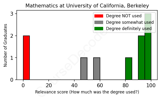 The verdict? Slightly below average. Overall, with an average relevance score of 66%, Mathematics graduates from University of California, Berkeley have a slightly lower likelihood (-1%) of finding work in this field compared to the average graduate across all fields: