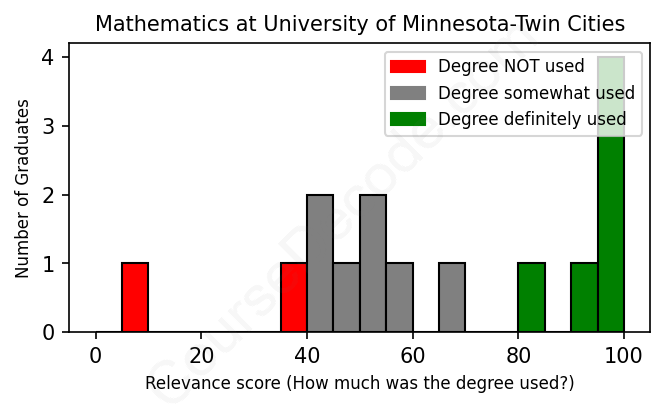 The verdict? Slightly below average. Overall, with an average relevance score of 65%, Mathematics graduates from University of Minnesota-Twin Cities have a slightly lower likelihood (-2%) of finding work in this field compared to the average graduate across all fields: