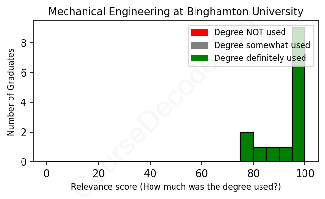 The verdict? Great! Overall, with an average relevance score of 93%, Mechanical Engineering graduates from Binghamton University have a substantially higher likelihood (+26%) of finding work in this field compared to the average graduate across all fields: