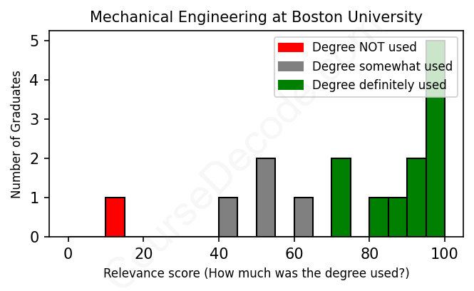 The verdict? Above average. Overall, with an average relevance score of 75%, Mechanical Engineering graduates from Boston University have a higher likelihood (+8%) of finding work in this field compared to the average graduate across all fields: