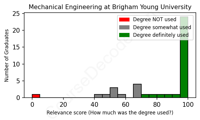 The verdict? Significantly above average. Overall, with an average relevance score of 84%, Mechanical Engineering graduates from Brigham Young University have a much higher likelihood (+17%) of finding work in this field compared to the average graduate across all fields: