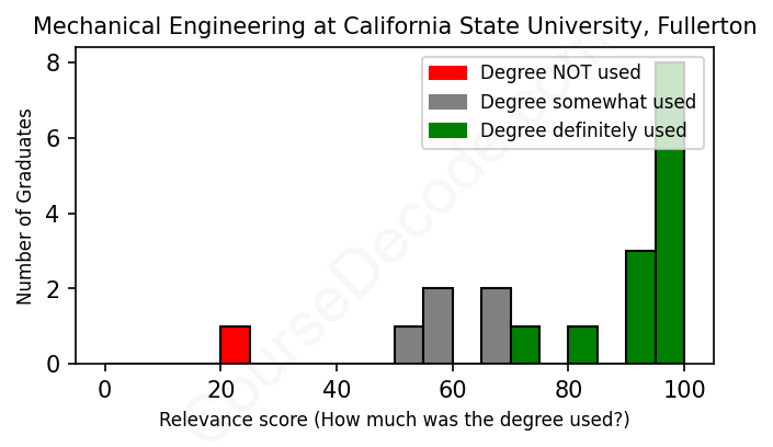 The verdict? Significantly above average. Overall, with an average relevance score of 81%, Mechanical Engineering graduates from California State University, Fullerton have a much higher likelihood (+14%) of finding work in this field compared to the average graduate across all fields: