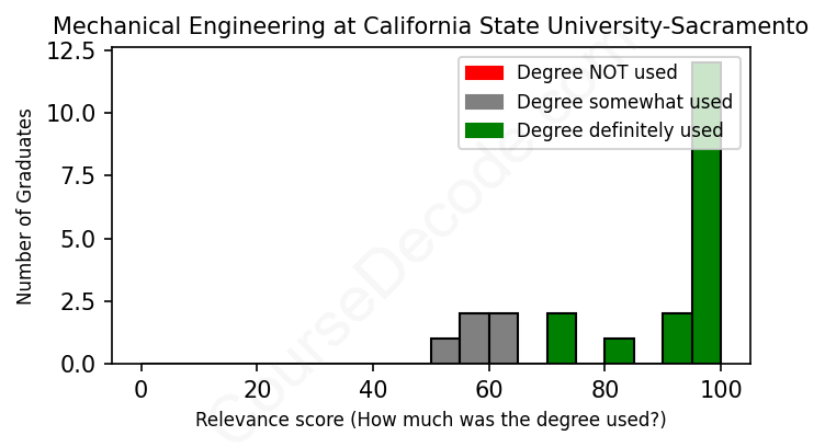 The verdict? Significantly above average. Overall, with an average relevance score of 85%, Mechanical Engineering graduates from California State University-Sacramento have a much higher likelihood (+18%) of finding work in this field compared to the average graduate across all fields: