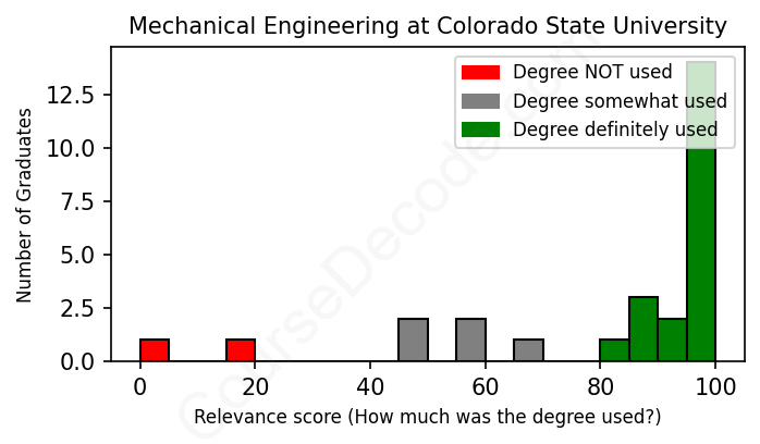 The verdict? Significantly above average. Overall, with an average relevance score of 81%, Mechanical Engineering graduates from Colorado State University have a much higher likelihood (+14%) of finding work in this field compared to the average graduate across all fields: