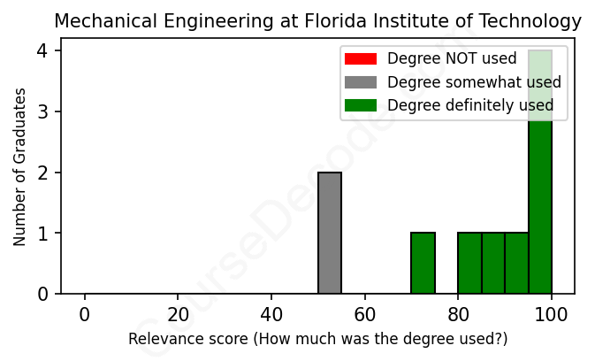 The verdict? Significantly above average. Overall, with an average relevance score of 82%, Mechanical Engineering graduates from Florida Institute of Technology have a much higher likelihood (+15%) of finding work in this field compared to the average graduate across all fields: